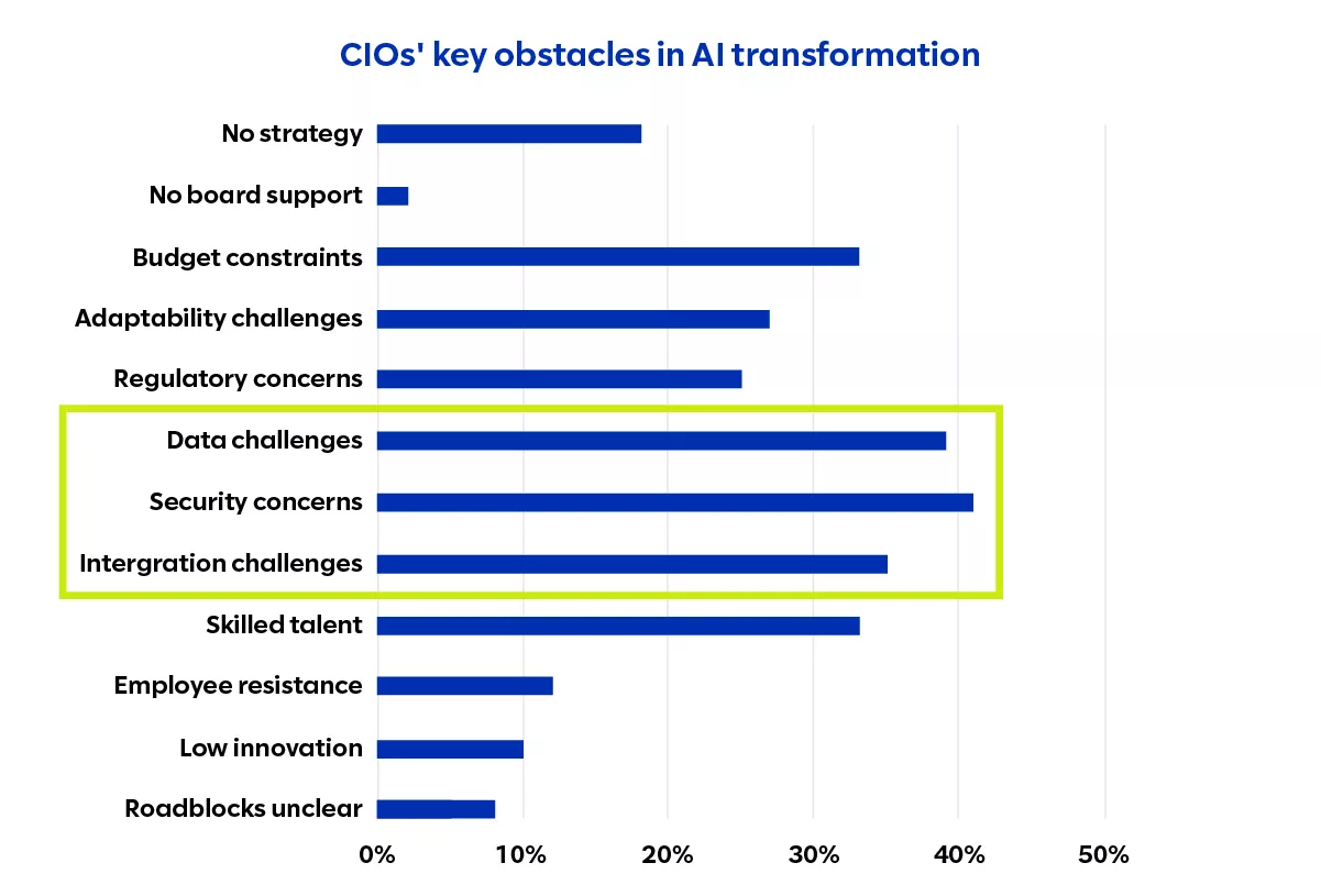 Since most engineering leaders are currently experiencing technical debt, the scenario Frigeri describes must be quite common. This may help explain why CIOs’ top three obstacles in AI transformation according to Slalom’s 2023 executive survey on AI transformation are all quite technical in nature: data challenges, security concerns, and integration challenges.